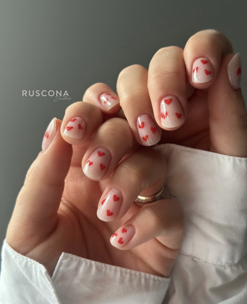 Die klassische französische Maniküre erhält einen romantischen Valentinstag-Touch. Anstelle der traditionellen weißen Spitze kommen zarte Rosa-, Rot- oder Perlmutttöne zum Einsatz, oft ergänzt durch kleine Herzchen, dünne Linienoder dezenten Glitzer. Im Trend liegen auch Mikro-French-Spitzen und ungewöhnliche Formen, die elegant, aber gleichzeitig verspielt und festlich wirken.