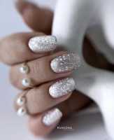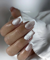 - Komplett mit Glitzer verzierte Nägel in zarten Champagner-, Silber- oder Eisblau-Tönen.