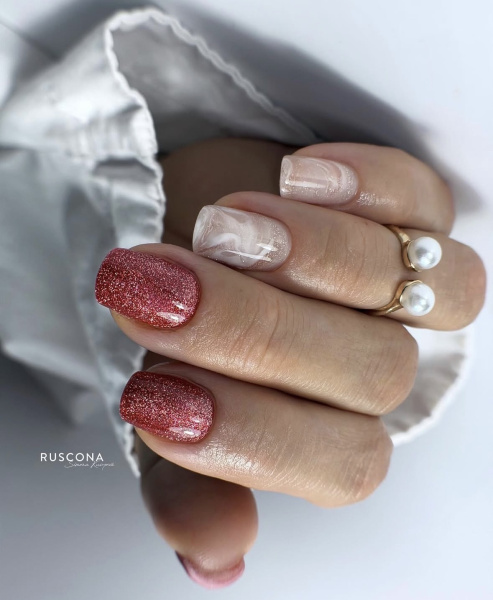- Glam Accent Nail – ein oder zwei Nägel mit auffälligem Glitzer, die übrigen minimalistisch
