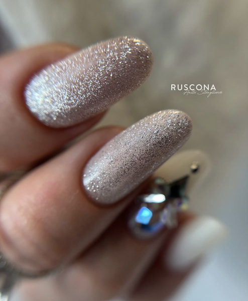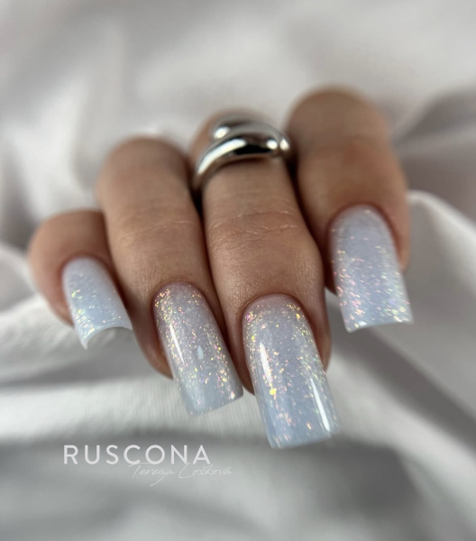 - Komplett mit Glitzer verzierte Nägel in zarten Champagner-, Silber- oder Eisblau-Tönen.